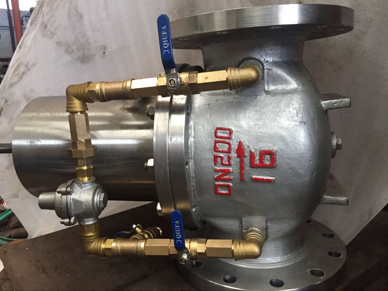 当减压阀的出口处(P2)装有控制阀门,且控制阀门关闭时减压阀的工况为:反馈系统控制阀的Pk 值增大,直到控制阀关闭。控制阀关闭后,主阀的Pk 值增大,增大的Pk值迅速克服主弹簧的压力(Pt)使主阀关闭。因此,自动关闭后的减压阀的出口压力仍是一个稍高于P2值的低压,当出口处(P2)的控制阀门重新开启时,减压阀恢复至初始工况。 7.2 ZTY46H型减压阀的辅助功能工作原理 在组合式减压阀中,由于其控制特点(减压阀的出口压力的稳定由反馈系统自动控制),反馈系统的性能是至关重要的。ZTY46H型减压阀不同于原组合式减压阀之处就是具有性能超群的反馈系统。系统的抗泥沙、反冲排污、反馈系统的切换功能较原产品来说操作更为简单、稳定性更好、使用寿命更长。ZTY46H型减压阀的反馈系统*可以安装在老产品的主阀上,与老产品的反馈系统有着*的互换性。也就是说,在老产品上完够进行 ZTY46H型减压阀的反馈系统的改造。 7.2.1反馈系统的反冲排污工作原理 当控制阀的滤网堵塞超过一定程度时,控制阀进口的压力会升高,导致主阀的PK值升高,导致主阀过流面减小,出口压力P2值减小。此时,只要进行反冲排污操作,系统就可恢复正常。如右图所示:首先,关闭压力导管控制阀(由于主活塞下方压力腔被封闭和水的不可压缩性,主阀的过流面积不变,减压阀的P2值仍是一个低压);其次、将三通阀旋转90ο,三通阀将反馈系统的顺向水流关闭、排污口打开;在减压阀出口压力的作用下,水流反向,控制阀出口变成进口,水流从滤网内向外,经三通阀排出系统外,同时带走附着在滤网外的杂质;后、按关闭三通阀、打开压力导管控制阀的顺序操作,反馈系统恢复正常。 7.2.2减压阀的双控制反馈系统 为保证减压阀的安全可靠性,ZTY46H型减压阀采用双反馈控制系统。在减压阀工作时一套系统作为主用,另一套系统作为备用;在主用系统发生故障时,通过简单的操作,就可投入备用系统,不影响减压阀的工况;故障系统可在减压阀的工况下维修,维修完毕,又可作为备用。这种系统 为保证减压阀的安全可靠性,ZTY46H型减压阀采用双反馈控制系统。在减压阀工作时一套系统作为主用,另一套系统作为备用;在主用系统发生故障时,通过简单的操作,就可投入备用系统,不影响减压阀的工况;故障系统可在减压阀的工况下维修,维修完毕,又可作为备用。这种系统的互为备用在大的限度上保证的减压阀运行的安全可靠性。工作原理如下图五所示: 图为下反馈压力补偿系统处于工作状态。如图五、b所示:反馈压力补偿系统的A、B点的三通阀处于正常位置,C点的压力导管控制阀上面的处于关闭工况,下面的处于开启工况。当切换时顺序为:关FC1;旋转Fa至90o; 旋转Fb至90o;开FC1。至此,切换完成。 7.2.3减压阀的安全锁定 本减压阀的安全锁定技术是在双反馈系统*损坏、击穿的十分恶劣工况下,安全锁定装置自动投入,将减压阀的过流面积刚性锁定,有效地防止减压阀的出口低压升至高压的技术。 如图六所示:减压阀的安全锁定装置是由安全拉杆、双锁定螺母、调节螺杆和活塞组成。在正常工况下,经调整双锁定螺母,使其下面与调节螺杆的上面留有一个合适的间隙h。减压阀正常工作时,安全拉杆为空载,不影响正常工况。当主用、备用反馈系统全被高压击穿时,由于PK的失压,在主弹簧的大刚度压力下节流锥和阀座的开度为大值,此时的P1、P2压力相等,高压水会破坏用水设备。由于本减压阀装有安全锁定装置,故在出现上述工况时,h自动消失,节流锥和阀座的开度被锁定在一定位置,P2压力稍高于原压力,保护了用水设备的安全。 8、产品的安装 8.1、安装前应仔细校对阀门上的标志和标牌中所列出口压力是否与使用要求相符,进出口侧通道、管道均应擦净,以防尘埃、杂物进入阀内损坏控制阀及破坏活塞的运动密封性。并注意减压阀的方向性。 8.2减压阀必须水平安装,进出口端均应安装闸阀以便于维修,并应考虑给主阀调节杆旋转调节留以适当空间。 8.3、当水中泥沙,污物较多时,阀压阀前应装有污物汇集器(或过滤器)。 8.4、当进出口压力差值较大时,为使设备安全运行,要求用户在低压管道(即减压阀出口端)上加装安全阀。 8.5、本阀门在出厂时,如果用户在订货时无特殊说明,均按大进口压力和出口压力分级范围中的下限进行调整并在标牌上注明,如与实际工作条件不符需重新进行调整。 8.6、控制阀在出厂时已调整并用螺钉紧定,用户在日常工作运行中一般不必自行调整,更不能频繁旋转调节帽,以防损坏阀中敏感元件。只有当出口压力值与额定工作压力值发生差异影响工况时才可进行调整。 8.7、主阀在正常运行中如果阀中运动件(活塞)密封和静密封部位发生破坏使之泄漏时,将使阀门工作特性受到很大影响,此时应及时更换密封圈。 8.8、当用户需要时,可选用改进型产品,以确保满足使用条件。 8.9、安装后的阀门底端必须给予合适的支撑,不得使管道中的应力集中在阀门上,以免影响阀门正常工作。如图所示: