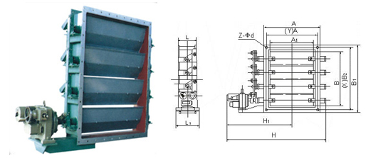 二.结构简介 1.采用单轴驱动双百叶窗式挡板结构,双层叶片中间设计有导入密封空气的密封室,将至少高于烟气压力500Pa的密封空气通入挡板,使双层挡板之间形成密封空气隔离层,阻断烟气流的通过。 2.启闭时间≤60S(可根据用户要求选定)。 3.壳体外部设计有连杆机构,优化设计后使挡板各叶片启闭呈百叶窗流线型方式,开启或关闭同步,实现一体化操作。 4.设计结构合理,叶片刚性好,运行稳定可靠,叶片密封型式:弹性密封和气密封,壳体上设计安装有密封风入口阀,与挡板门联锁控制。叶片间通入具有一定压力和流量的密封空气后,能有效隔绝叶片前后烟气流,从而使挡板门密封效率为99%。 5.在保证工作条件下转动灵活,无卡涩现象。采用座架式(耐高温)带座调心轴承结构,使挡板驱动力矩更小,转动更灵活轻巧。挡板叶片设计有热膨胀补偿间隙,热态运行下安全可靠。 6.挡板设计成流线形结构,可充分降低对气流的阻力。其中门外部框架采用型钢制作,叶片设计采用机翼型(或平板型)结构,使气流分配合理顺畅。叶片本体由普通碳钢或合金钢制成,叶片搭接(或与壳体密封)处为具有弹性的不锈钢或镍基合金钢密封片,具有符合工况参数条件下的强度和刚度,并牢固的附着在加伸轴上。每个风门叶片的轴柄装置由两个外部安装、自动找平、不需维护的带法兰盘轴承加以支撑,有效避免因挡板前后轴不同心产生驱动扭矩的增加或运行后叶片启闭时产生卡涩现象。 7.现烟连接方式为烟道插入挡板门反法兰内密封焊接,出厂前正反法兰螺栓定位连接,现场补密封焊。因防腐要求而带有内衬的挡板门现场吊装后正反法兰处密封焊,须保证内衬处密封焊接,现场防腐层必须盖住壳体内衬。 8.驱动方式一般为电动或气动。控制方便可靠。可输入、输出开关量信号(或输入输出模拟量信号),以根据系统运行机制要求对叶片开度实现控制并实时反映叶片开度状态。可以远距离操作或程序控制,方便DCS控制自动化。 9.电(气)动执行机构采用智能一体化控制,具有力矩保护和限位开关,可就地或远方控制操作,还具有手、电(气)动切换功能以备安装调试、检修时使用。安装调试后出厂。 出厂前已对电(气)动装置的限位开关进行调整设置到位,用户只需通入电源(或气源)并与接线端子连接即能使挡板门正常工作。 10.密封风系统的密封风机和电加热器可由我方选型后成套提供。