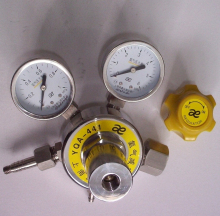 YQA-441型氨气减压阀使用说明 氨气减压阀的本体是由不锈钢制成。两级减压系的构造基本相似,均由活门顶杆、调压弹簧、弹性薄膜装置、减压门等零部件组成。减压系统主要用于将高压气体自动降为中压气体,降力为2MPa,然后送入二级减压系统。在二级减压系统,当旋拧调压螺钉时,通过调压弹簧、弹性薄膜装及活门顶杆,使减压活门作不同程度的开启和关闭,以用来调节一减压系统送入的氧气的减压程度或停止供气。 氨气减压阀一般是瓶装气体的减压装置。当进口压力和出口流量发生变化时, 保证其出口压力始终维持稳定。低压表读数上升可能预示潜在危险和隐患。操作人员是否知道机器的工作范围。是否认真阅读过说明书。是否违反操作规则。所购买产品是否合格。说明书上是否有。如果工作环境气温很低,需要查看活门是否出现了冻结或冰塞现象。  氨气减压阀可分为集中式和岗位式两类;按构造不同可分为单级式和双级式两类;按工作原理不同可分为正作用式和反作用式两类。目前,常见的国产减压阀以单级反作用式和双级混合式(级为正作用式、第二级为反作用式)两类为主。