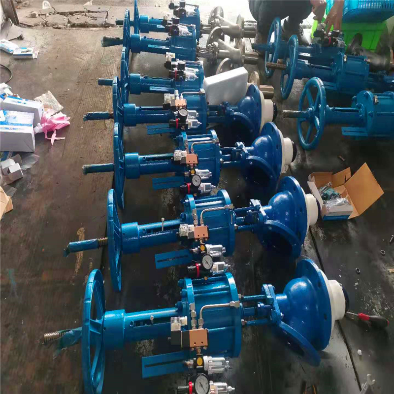 储料罐气动放料阀设计选型产品特点 (1)密封面磨损均匀及擦伤较轻,密封性能好 上展式和下展式放料阀阀瓣与阀杆为整体连接,钢性好磨损均匀,密封性能可靠,连续使用周期长。 (2)启闭行程不同,安装尺寸有大小 上展式和下展式放料阀启闭行程小、安装高度较小。 柱塞式放料阀按柱塞结构和运动方式分为升降杆和旋转杆两种结构形式,升降杆结构形式它要求有较大的安装空间,但可依据柱塞的运动方式和位置直观地判断阀门的启闭和位置。旋转杆结构形式安装高度最小,在启闭过程中柱塞只做旋转运动,它要依据带有启闭位置指示器来判断阀门的启闭和位置。 (3)启闭力矩不同 上展式放料阀为阀瓣向上运动阀门打开,打开时阀门需克服介质作用力,打开时较关闭力矩大。 下展式、柱塞式放料阀为阀瓣(柱塞)向下运动阀门打开,打开时运动方向与介质作用力相同,因而打开时较关闭力矩小。