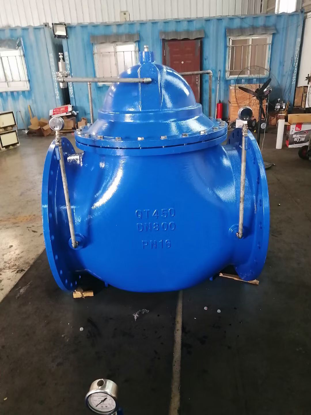 当阀门从进口端给水时,水流过针阀进入主阀控制室,出口压力通过导管作用到导阀上。当出口压力高于导阀弹簧设定值时,导阀关闭。控制室停止排水,此时主阀控制室内压力升高并关闭主阀,出口压力不再升高。