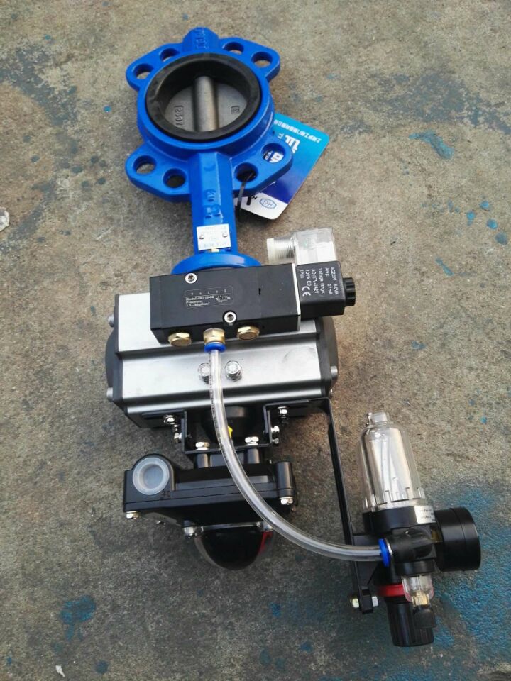 气动对夹式中线软密封蝶阀设计规范产品特点 1.气动蝶阀操作力矩小,是所有阀类中操作力矩*小的一种,启闭迅速,以压缩空气为动力,通过活塞齿条,齿轮的机械传动阀杆,以角行程输出的扭矩转动阀板0~90°,就能快速的完成启闭动作,结构简单、体积小、重量轻、流阻小、流量系数大,密封性能好。调节范围大。是自动化控制系统中仪表的执行单元; 2.采用电-气阀门,以电信号和压缩空气为动力,接受控制系统输入的0-10mA DC或4-20mA DC电流信号,由调节器将压缩空气,转换成气源压力信号输入输出,改变阀板的旋转角度(0-90°任意角度),具有较好的调节控制流量等参数。 3.采用电磁换向阀、阀位回讯器,以AC220V或DC24V电源电压和压缩空气作动力,实现对流体介质的快速二位切断控制。 4.气动执行机构采用活塞式气缸及曲臂转换结构,输出力矩大,体积精小,采用全密封防水设计防护等级高。气缸体采用镜面气缸,无油润滑,磨擦系数小、耐腐蚀、具有低用性及可靠性。所有传动轴承均采用边界自润滑轴承无油润滑,确保传动轴不摩损。 对夹软密封蝶阀产品概述 手柄对夹软密封蝶阀是以橡胶为密封材料的中线蝶阀,与多层次金属硬密封蝶阀相比,不仅价格更加低廉,而且密封性更好,无论是气压测试还是水压测试,都可以达到零泄漏的标准。这种软密封蝶阀采用中线垂直板结构,以阀杆为中心两端结构对称,没有流向区分的双向密封结构,也是一种双向软密封蝶阀。
