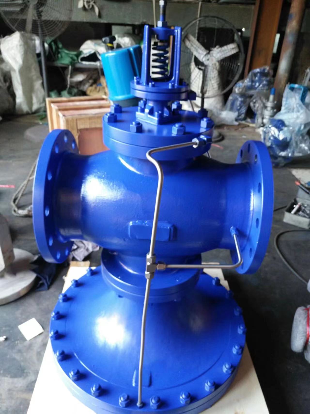 所有类型的控制阀都应避免尺寸过大,减压阀同样如此。当通过湿蒸汽时靠近阀座工作的阀塞可能会发生拉丝和过早腐蚀。此外,过大的阀芯的任何微小动作都会使通过阀门的流量产生较大的变化,使阀门更难以准确控制。在需要精确控制压力或大流量的情况下,可以使用先导式减压阀。示意性地显示了这种阀门。先导式减压阀通常比相同容量的直接作用阀小。膜片采用了新型材料,并大大加式了式作面积,因此阀门上游压力或下游负荷细微的变化都能及时准确的反馈到主阀膜片,来调节主阀的开度,确保下游压力的稳定。 同一个阀体上可安装和互换多个导阀在稳压的同时,实现温度控制、上游压力的控制、远程的开关控制等。适用于蒸汽介质管路上,通过调节先导阀的调节螺钉,就可将进口压力降低至某一需要的出口压力。当进口压力与流量有变化时,靠介质本身能量,可自动保持出口压力在一定范围内,实现精确稳定的压力控制。