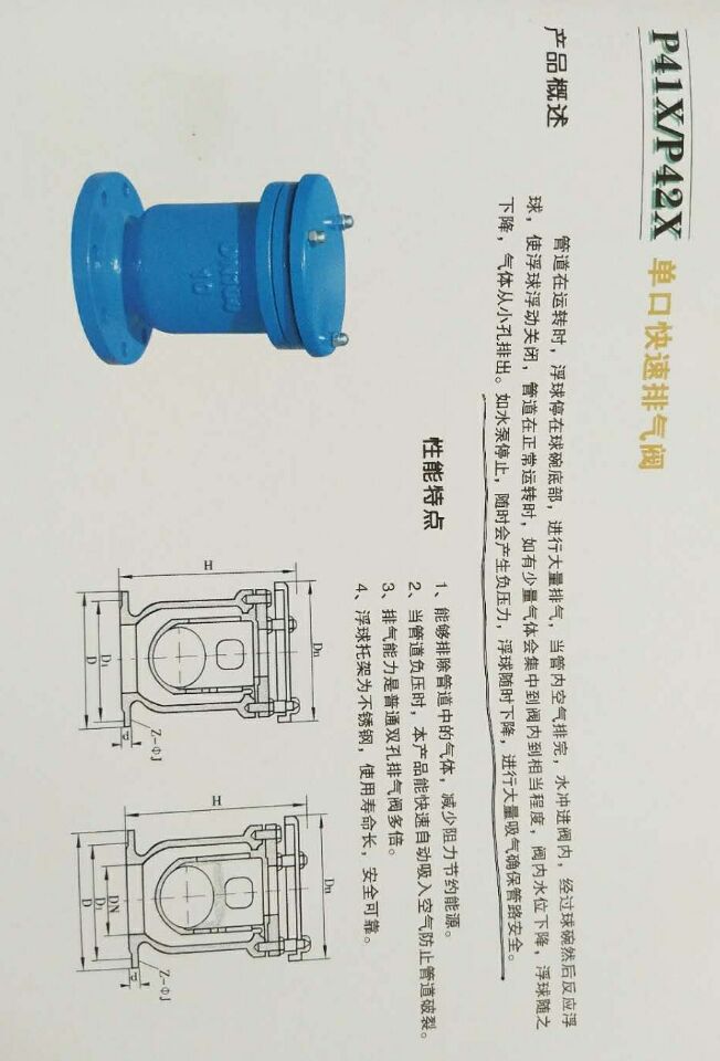 快速排气阀主要技术参数和性能指标 1.介质:清水 2.温度:常温 3.阀体:灰铸铁HT200 4.浮球与塞头:不锈钢 5.密封材料:丁晴橡胶 6.阀体试验打压:1.5mpa 7.浮球、密封试验打压:0.05-1.1MPA不漏水 2、管道存气地点的分析 (1)管道坡顶。对于有坡度管道,气体在水中一般都是上行的,很容易在坡顶发生聚集。 (2)管道小的凸起部分。一般的管道都有些高低不平,凸起的位置容易存气产生气囊。 (3)管径变化处和管道交叉处。当水流速度不大时,气体会聚集无法被水流带走,形成气囊。 (4)逆坡管道和沿水流下降的∽形地形的中部。逆坡管道水向下流而气泡向上运动,当浮力不足以克服水流推力时,气体便聚集。气体容易在∽形地形的中部形成波状流及段塞流。 (5)管道变坡处。管道变坡,产生憋气,排气不畅。  3、排气阀设置地点 (1)多起伏的管道,应在各高点位置设置排气阀。 (2)离闸阀或离水泵较近的管道小的凸起部分。一般的管道都有些高低不平,我们需要慎重排气。离闸阀或离水泵较近的管道小的凸起部分,容易水击伴随着气体产生破坏。可采用微量排气阀。 (3)下降坡度变大点、上升坡度变小点,应在变点位置设置排气阀。 (4)长距离顺着水流地形下降的逆坡管道,宜间距不超过1000米布置排气阀。 (5)沿着水流下降的∽形地形,可以适当安装排气阀。