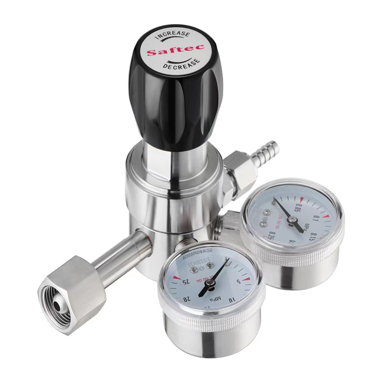 316L不锈钢氮气钢瓶减压阀技术参数减压器的一些分类: 1.介质:氧气减压器、乙炔减压器、氮气减压器、空气减压器、氩气减压器、氢气减压器、氦减压器、二氧化碳减压器、丙烷减压器、天然气减压器和具有腐蚀性的不锈钢减压器, 2、功能:也可分为集中型和项目型;根据结构的不同,可分为单级和两级两种类型。 3.工作原理:分为两种类型:正作用型和反作用型。目前,国内常用的压力调节器有单级反应型和两级混合型(第一级为正作用式、第二级为反作用式)。